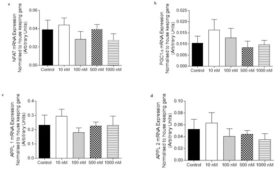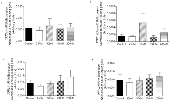 The abundance of mRNA expressed for markers involved in adiponectin signalling, fatty acid oxidation and oxidative capacity in C2C12 myotubes treated for 24 h with O-1602 (10–1000 nM). mRNA expression was normalised to housekeeping gene Hypoxanthine Phosphoribosyltransferase (HPRT1) and grouped data is reported as mean (arbitrary units) ± SEM. (a) Nuclear Factor of Activated T-Cells calcineurin dependent 1 (NFATc1); (b) Peroxisome proliferator-activated receptor gamma co activator 1-alpha (PGC1α); (c) Adaptor protein containing pleckstrin homology domain, phosphotyrosine binding domain and leucine zipper motif 1 (APPL1); (d) Adaptor protein containing pleckstrin homology domain, phosphotyrosine binding domain and leucine zipper motif 2 (APPL2).