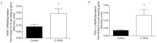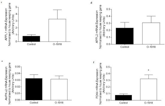 The abundance of mRNA expressed for markers involved in adiponectin signalling, fatty acid oxidation and oxidative capacity in C2C12 myotubes treated for 24 h with O-1918 (100 nM). mRNA expression was normalised to housekeeping gene Hypoxanthine Phosphoribosyltransferase (HPRT1) and grouped data is reported as mean (arbitrary units) ± SEM (* significance p < 0.05). (a) Nuclear Factor of Activated T-Cells calcineurin dependent 1 (NFATc1); (b) Peroxisome proliferator-activated receptor gamma co activator 1-alpha (PGC1α); (c) Adaptor protein containing pleckstrin homology domain, phosphotyrosine binding domain and leucine zipper motif 1 (APPL1); (d) Adaptor protein containing pleckstrin homology domain, phosphotyrosine binding domain and leucine zipper motif 2 (APPL2); (e) Adenosine Monophosphate Kinase alpha 2 (AMPKα2); (f) Pyruvate Dehydrogenase Kinase 4 (PDK4).