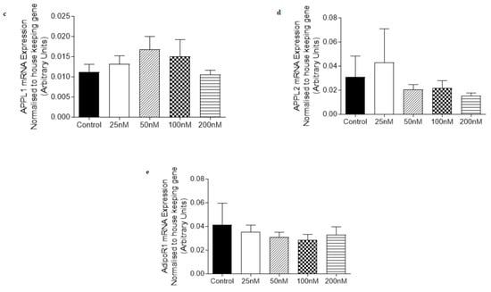 The abundance of mRNA expressed for markers involved in adiponectin signalling and oxidative capacity in human primary rectus abdominus-derived myotubes obtained from individuals that are obese and have type two diabetes mellitus treated for 24 h with O-1918 (25–200 nM). mRNA expression was normalised to housekeeping gene Cyclophilin and grouped data is reported as mean (arbitrary units) ± SEM. (a) Nuclear Factor of Activated T-Cells calcineurin dependent 1 (NFATc1); (b) Peroxisome proliferator-activated receptor gamma co activator 1-alpha (PGC1α); (c) Adaptor protein containing pleckstrin homology domain, phosphotyrosine binding domain and leucine zipper motif 1 (APPL1); (d) Adaptor protein containing pleckstrin homology domain, phosphotyrosine binding domain and leucine zipper motif 2 (APPL2); (e) Adiponectin Receptor 1 (AdipoR1).