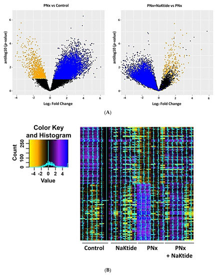 RNAseq analysis was performed following elimination of any gene which had <11 total counts in the 24 samples, in order to reduce the effect of genes which had very low expression. This resulted in a gene expression set containing 16,057 genes. Of these, 725 were noted to be downregulated and 4766 upregulated with an unadjusted p-value of 0.05. Using a Benjamini–Hochberg (BH)-adjusted p-value of 0.1, there were 5876 genes downregulated and 1148 genes upregulated. These results are shown by volcano plots in Figure 1A for the gene set comparing PNx and Control (left panel) and PNx + NaKtide vs. PNx (right panel). Interestingly, transduction of NaKtide in the adipose tissue tends to reverse changes in the gene expression, induced by PNx. This is further illustrated by a heat map of gene expression of the top 100 down and 100 upregulated genes shown in the sham and PNx animals ± adipose NaKtide expression (Figure 1B).
