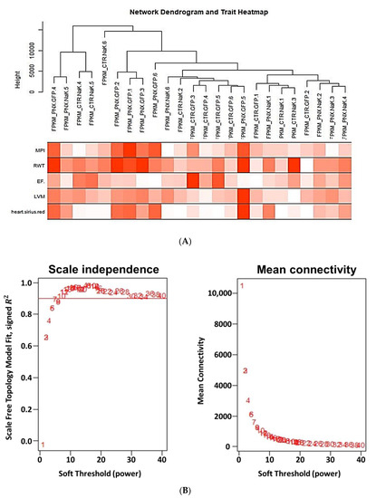 (A) Network dendrogram and trait heat map. Hierarchical clustering of treatment groups that summarize the modules found in the clustering analysis. Branches of the dendrogram cluster together into treatment groups that are positively correlated. Heat map displays correlation between different parameters analyzed. (B) Scale independence and mean connectivity as a function of soft threshold in PNx model. Based on these data, we chose a soft threshold (power) of 20 to construct the network(s) described in subsequent figures. (C) Dendrogram and group assignments produced from network generation on gene expression derived from in vivo experiment. Network produced using R package WGCNA where data on dendrogram represents distance metric (1-Pearson coefficient). Genes clustered according to a topological overlap metric into modules; assigned modules are colored at the bottom, gray genes are unassigned to a module. (D) Module-trait relationships of different parameters analyzed and major pathways associated with cardiac phenotype. Each row in the table (right panel) corresponds to different gene groupings, and each column to selected cardiac phenotypical features. Based on the highest correlations with these 5 phenotypical features (myocardial performance index (MPI), relative wall thickness (RWT), ejection fraction (EF), left ventricular mass (LVM) and cardiac fibrosis (CF)), five groups of genes were further analyzed for ORA against the KEGG database (left panel).