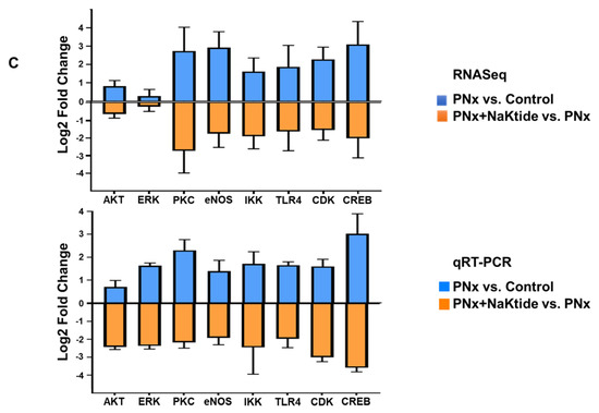 In order to validate the high throughput RNA-sequencing data, previously extracted total RNA from visceral adipose tissue of our in vivo groups were used to perform qRT-PCR reactions. Briefly, following total RNA extraction and preparation of cDNA libraries, qRT-PCR reactions were performed in triplicate using SYBR Green PCR Master Mix on a 7500 HT Fast Real-Time PCR System (Applied Biosystems, Foster City, CA, USA), as described previously [13]. The relative mRNA expression levels of eight differentially expressed genes, related to oxidative stress and inflammation, was determined. These genes included AKT (gene symbol: Akt3), ERK (gene symbol: Mapk1), PKC (gene Symbol: Prkca), eNOS (gene symbol: Nos3), IKK (gene symbol: Chuk), TLR4 (gene Symbol: Tlr4), CDK (gene symbol: Cdkn1a) and CREB (gene symbol: Creb). The fold changes were calculated from relative expression for PNx versus Control and PNx + NaKtide versus PNx, followed by estimation of log2 Fold Change values per candidate gene to compare RNAseq and qRT-PCR findings.