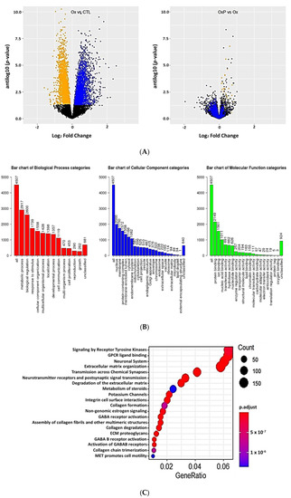 (A) Volcano plots of gene expression in adipocytes exposed to oxLDL (Ox) vs. control (CTL) (left panel) and oxLDL+ pNaKtide (OxP) vs. oxLDL (Ox) expression (right panel) plotting antilog of unadjusted p-value on y-axis vs. log2 Fold Change on x-axis. Genes downregulated (unadjusted p-value < 0.1) by oxLDL colored orange and genes upregulated (unadjusted p-value of <0.1) by oxLDL colored blue. We note that addition of pNaKtide expression moved upregulated genes down and downregulated genes up. (B) Gene Ontology summary of over representation analysis (ORA) in oxLDL treated murine adipocytes. Gene ontology annotation of biological processes, cellular components and molecular function categories. (C) Reactome ORA of differentially expressed genes in oxLDL treated murine adipocytes. The scatter dot plot of reactome enrichment representing the number of differentially expressed genes enriched in GO terms.