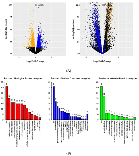 Data from RNA-Seq experiments are presented in “volcano” plots as the anti-log10 of the raw p-value against the base 2 log of the fold change (“log2 fold change”; Figure 1A, Figure 4A and Figure 5A). A Benjamini–Hochberg adjusted p-value of 0.1 was used as a threshold for the ORA analysis [57]. In order to keep naming consistent throughout, all raw p-values were called “unadjusted p-value” and all adjusted p-values are called “BH-adjusted p-value”. For the GSEA, the entire gene dataset was used allowing the GSEA algorithm to apply the log2 fold change data to determine whether gene sets were coordinately over or under expressed [62]. The significance values for the overrepresentation of different pathways were calculated with the fgsea R package. Virtually identical gene pathways with similar estimated p-values were identified by querying the WebGestalt website with the overall set of genes and log2 fold change values observed.