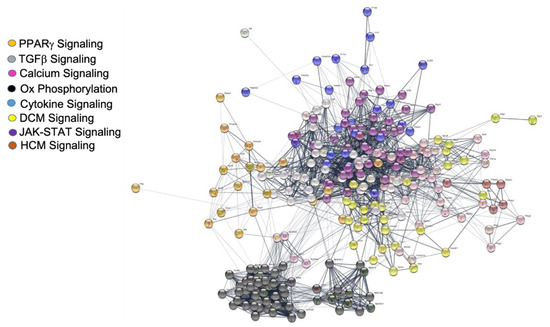 - Szklarczyk, D.; Morris, J.H.; Cook, H.; Kuhn, M.; Wyder, S.; Simonovic, M.; Santos, A.; Doncheva, N.T.; Roth, A.; Bork, P.; et al. The STRING database in 2017: Quality-Controlled protein-protein association networks, made broadly accessible. Nucleic Acids Res. 2016, 45, D362–D368. [Google Scholar] [CrossRef]