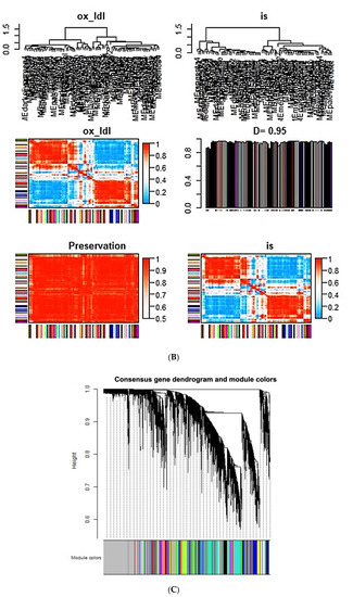 Topological analysis was performed using the WGCNA R package [64]. First, the in vivo gene expression was examined in concert with in vivo characteristics which we have previously reported [13]. Evaluation of initial groupings did not show a need to exclude any in vivo or in vitro group. We next established a soft threshold for network construction by examining topological characteristics over a range from 2 to 40. After analysis of both the in vivo and in vitro data sets, it was decided to choose a power of 20 for all further calculations (Figure 2B). Subsets of genes were determined by merging those that had cut differences of <0.01 which allowed for dendrogram and module construction, and for the in vivo data, correlation of key in vivo parameters with the specific modules. For the in vitro data, we compared the effects of IS and oxLDL by separating the in vitro data into 2 sets of 4 groups. Both sets contained the control and pNaKtide groups; one set included the IS and IS + pNaKtide groups while the other included oxLDL and oxLDL + pNaKtide. Once these comparisons were made, we then compared the in vivo gene expressions with the in vitro gene expressions, merging the IS and oxLDL sets. Topological characteristics were compared using the aforementioned WGCNA package [65], following the step by step instructions at the website https://horvath.genetics.ucla.edu/html/CoexpressionNetwork/Rpackages/WGCNA/Tutorials/.