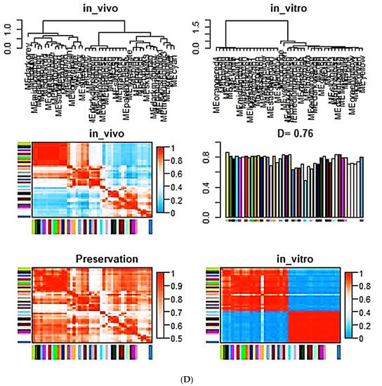 In the case of topological analysis and, in particular, the comparison of different gene expression sets, we focused on highly correlated gene expressions along with (in the case of the in vivo data set) phenotypical features using the WGCNA R package as has been reported recently [65].