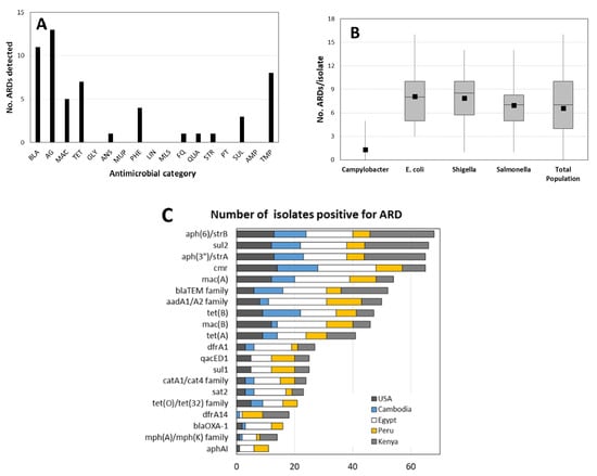The number of ARDs per strain ranged from none (several Campylobacter spp. strains) to sixteen, with median and mean values of seven and 6.58 genes per isolate, respectively (Figure 1B). Among the Enterobacteriaceae, 91% harbored genes which were predicted to cause resistance to at least three categories of antimicrobials (Table 1, top).