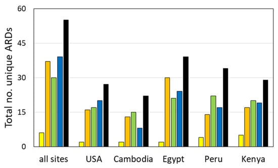 Numbers of unique ARDs observed for Campylobacter spp. (yellow), E. coli (orange), Shigella spp. (green), Salmonella (blue), and all species (black) detected in isolates from each collection site.