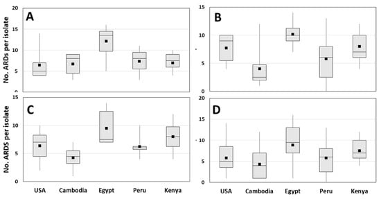 Cambodia had the lowest total number of unique ARDs detected for the population as a whole and for each of the four genera tested. The lowest number of ARDs per isolate for Shigella spp., Salmonella spp., and all genera combined were also observed in the Cambodian samples (Figure 3). Interestingly, neither the high levels of phenotypic resistance nor genotypic profiles observed in two previous studies of fecal isolates from Southeast Asia [80,81] were evident from the current study. This apparent contradiction suggests that the current study may have underestimated the true prevalence of AMR genes in the Cambodian samples. One explanation for this possible underestimation is that the Cambodian samples were isolated, extracted, prepared for microarray analysis, and subsequently tested on the ARDM v.2 microarray in Naval Medical Research Unit-2 (NAMRU-2) facilities. DNA from isolates collected at the other sites (USA, Egypt, Kenya, and Peru) was extracted at the site of collection and then the DNA was shipped to the US Naval Research Laboratory (NRL) in Washington, DC, USA; these extracted DNA preparations were then further prepared and analyzed on the microarrays within NRL facilities. Slight differences in instrumentation or handling between NAMRU-2 and NRL (e.g., ramp speed during fragmentation steps, cold blocks versus ice baths) may have affected the size and distribution of the tested nucleic acids, resulting in altered test sensitivity [82]. It should be noted, however, that a study of Cambodian wound isolates performed at the same time documented higher rates of carriage of specific ARDs in E. coli than observed here [83].