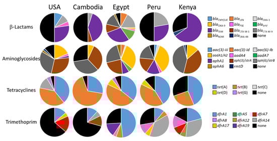 As a pilot-scale study, the numbers of isolates obtained per genus and per site hindered attempts to draw strong statistical conclusions from the data. However, a number of general trends were observed. Of the five collection sites surveyed, Egypt had the largest total number of ARDs detected in E. coli (30), in Salmonella (23), and overall (39) (Figure 2, Table 2, Table 3, Table 4, Table 5 and Table 6). Not surprisingly, the number of unique ARDs on a per-isolate basis was also highest in Egyptian samples for the three Enterobacteriaceae, suggesting that Egyptian isolates were more likely to possess MDR (Table 1 and Table 6, Figure 3). The high ARD carriage rate in the Egyptian isolates was largely due to the high diversity and rates of carriage of genes encoding β-lactamases (90%) and aminoglycoside modifying enzymes (100%) (Table 2, Table 3, Table 4, Table 5 and Table 6, Figure 4). Over half harbored at least three aminoglycoside ARDs and nearly half of those with β-lactamases encoded a CTX-M-type ESBL. In comparison, 30% to 50% of Enterobacteriaceae isolates from the USA, Cambodia, Peru, or Kenya were negative for all β-lactamase genes, and fewer aminoglycoside ARDs were present in each. The high prevalence of blaCTX-M-1 and blaCTX-M-9 families in Egyptian isolates also supports previous observations of high ESBL carriage [76,77] and may be related to the preferential consumption of extended-spectrum cephalosporins over narrow-spectrum penicillins in Egypt [78,79]. Furthermore, high carbapenem consumption in Egypt [79] may also have provided selective pressure for the single blaNDM-positive sample, also observed within this population. Of additional note, a significant percentage (27%) of the Egyptian Enterobacteriaceae harbored genes conferring resistance to AZM (two isolates with ere(A), five with mph(A)/mph(K)); Kenya was the only other site where AZM ARDs were carried at a similar rate (30% in Enterobacteriaceae).