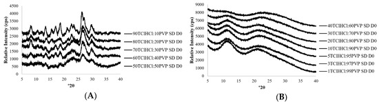 X-ray powder diffraction patterns of TClHCl:PVP solid dispersions (SDs) prepared from (A) 50TClHCl:50PVP to 90TClHCl:10PVP, in which all samples exhibited partial crystallinity, and (B) 1TClHCl:99PVP to 40TClHCl:60PVP immediately following lyophilization, in which all samples were amorphous.