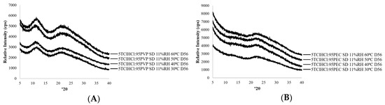 X-ray powder diffraction patterns of (A) 5TClHCl:95PVP and (B) 5TClHCl:95PEC solid dispersions (SDs) stored at 11% RH and 30–60 °C on day 56.