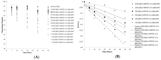 (A) Chemical stability of thiamine in various ratios of TClHCl:PVP solid dispersions (SDs) stored at 11% RH and 60 °C for 56 days. (B) First-order degradation regression lines of thiamine in various ratios of TClHCl:PVP dispersions stored at 11% RH and 60 °C for 56 days.