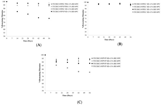 Chemical stability of thiamine in (A) 5TClHCl:95PEC and 5TClHCl:95PVP physical mixtures (PMs) compared to solid dispersions (SDs) stored at 11% RH and 60 °C for 56 days, (B) 5TClHCl:95PEC solid dispersions (SDs) stored at 11% RH and 30–60 °C for 56 days, and (C) 5TClHCl:95PVP solid dispersions (SDs) stored at 11% RH and 30–60 °C for 56 days.