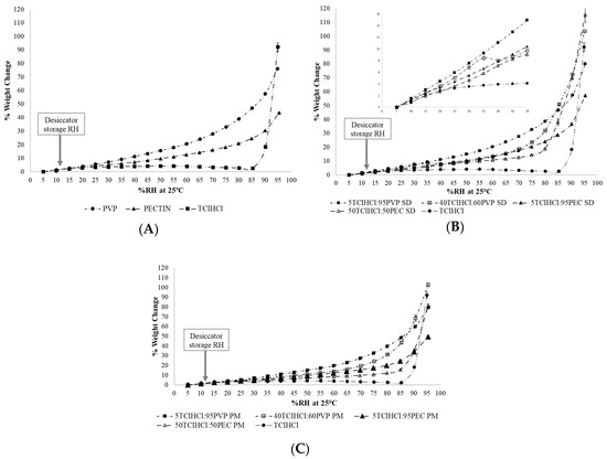Moisture sorption profiles of (A) PVP, PEC, and TClHCl at 25 °C; (B) TClHCl, 40TClHCl:60PVP, 5TClHCl:95PVP, 50TClHCl:50PEC, and 5TClHCl:95PEC solid dispersions (SDs) at 25 °C, with insert graph highlighting initial moisture sorption differences between SDs from 5–50% RH; and (C) 40TClHCl:60PVP, 5TClHCl:95PVP, 50TClHCl:50PEC, and 5TClHCl:95PEC physical mixtures (PMs) at 25 °C. The arrows in the profiles identify 11% RH, the desiccator storage RH, indicating that the moisture contents of all samples were similar at the storage RH.