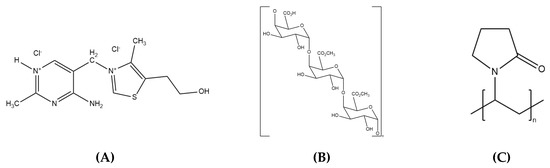 Chemical structures of (A) thiamine, (B) pectin, and (C) PVP.