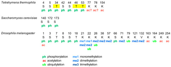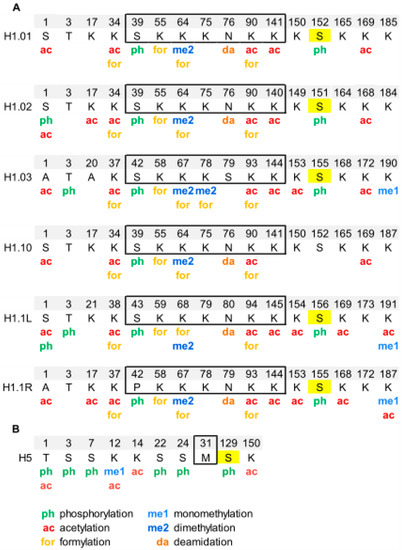 Bottom-up proteomics has identified and mapped a wide variety of PTMs in several eukaryotes (summarized in Tables S1–S3). To our knowledge, at least 13 PTM types have been identified in H1 including phosphorylation, methylation, acetylation, citrullination, crotonylation, ubiquitylation, formylation, 2-hydroxyisobutyrylation, and ADP-ribosylation (parylation) [29,30,32,42,43,44,45]. In this section, a brief overview of the PTMs identified in several model organisms is made. For consistency, in all cases, the modified residue number corresponds to the mature protein, which lacks the initial methionine. Therefore, for some modifications, the position number is not the same as the number in the original reference.