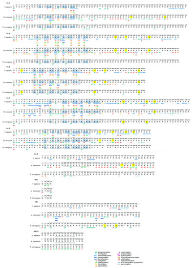 Identification of PTMs in histone H1 in mammals has been carried out mostly in humans and mice, although some PTMs were characterized in rat testis (Figure 3, Figure S2, Table S3). The most extensive bottom-up study identified multiple PTM types in human cell lines and several mouse tissues [29]. Other studies have targeted specific PTMs including phosphorylation [42], methylation [43], formylation [30], 2-hydroxyisobutyrylation [44], crotonylation [32] or specific cell lines [35,36], tissues [34], processes [57], and subtypes [58].