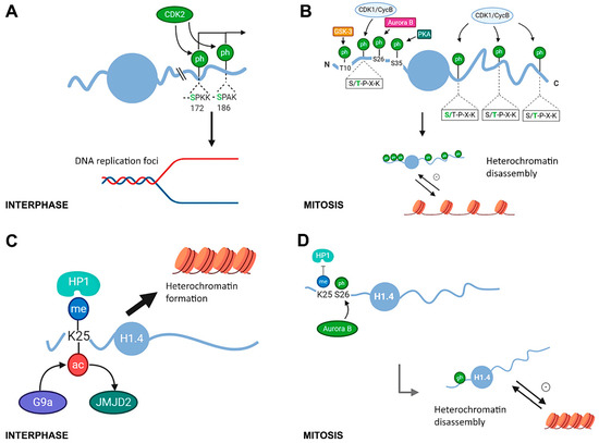 Modifications in histone H1 associated with chromatin compaction during the cell cycle. (A) In interphase, some CDK consensus motifs are phosphorylated presumably by CDK2. H1.2S172p and H1.4S186p have been linked to active transcription by RNAP I and II sites [40]. H1.5S172p and H1.2S172p have been shown to localize at active transcription sites and replication foci [70]. (B) In mitosis, H1 is hyperphosphorylated by CDK1 at CDK-consensus motifs and by GSK-3, Aurora B, and PKA at H1.5T10, H1.4S26, and H1.4S35. Those PTMs are thought to contribute to heterochromatin disassembly [69,70,71,83]. (C) H1.4K25 is methylated by histone methyltransferase G9a and demethylated by JMJD2 [88,89]. This modification recruits the heterochromatin protein HP1, promoting heterochromatin formation [69]. H1.K25 can also be acetylated, which would prevent methylation and HP1 binding [91]. (D) During mitosis, S26 is phosphorylated by the Aurora B kinase [84]. This modification inhibits HP1 binding, and thus may favor heterochromatin disassembly [69].