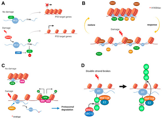 Phosphorylation, acetylation, ubiquitylation, and parylation of histone H1 have been associated with DNA damage response [72,73,74,75]. Most of the examples have been described in human cell lines, but some evidence in Saccharomyces cerevisiae has also been found [48].
