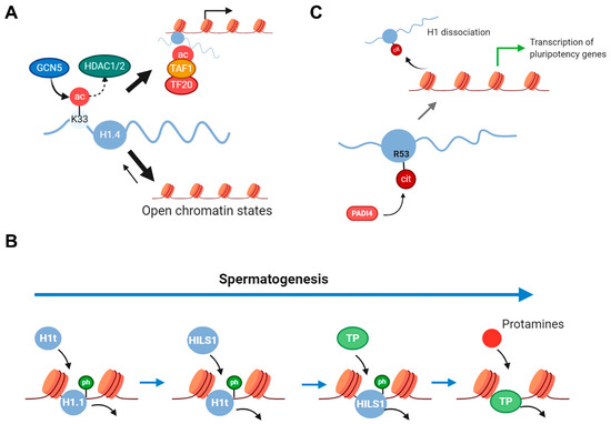 Several post-translational modification types in H1 have been associated with cell differentiation including acetylation, phosphorylation, and citrullination (Figure 6). H1.4K33 acetylation is catalyzed by GNC5 and can be deacetylated by class I and class II HDACs, but not by sirtuins [76]. ChIP-seq analysis showed that H1K33ac was enriched at active promoters, where it colocalized with H3K4me3. H1.4K33ac increases H1 mobility and is associated with transcriptional activation. This PTM promotes transcriptional activation by two different mechanisms: by reducing H1.4 affinity for chromatin and by recruiting TAF1, a subunit of the general transcription factor TFIID (Figure 6A). This modification is upregulated in induced pluripotent stem (iPS) cells, favoring H1 mobility, and the generation of the open chromatin state, characteristic of pluripotent stem cells. The dynamic behavior of this modification during spermatogenesis has also been studied, where high levels of H1.4K33ac were observed in the elongating spermatids, coinciding with chromatin reorganization. However, the signal disappeared in condensing spermatids and spermatozoa, suggesting that this PTM could contribute to chromatin opening, and therefore to the exchange of H1 with the testis-specific subtypes [76].