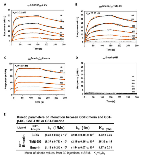 Affinity of emerin for β-DG and the TM domain of β-DG. Surface plasmon (A) resonance (SPR) assays were performed to determine kinetic parameters of the interaction of emerin with full-length β-DG or the TM domain of β-DG alone. GST–β-DG (A), GST–TMβ-DG (B), GST–emerin (C) of GST alone (D) were layered onto an SPR sensor, previously coated with GST–emerin. The responses (µRIU) observed for each protein concentration at different incubation times are shown. Analysis of emerin self-assembly served as positive control, while its interaction with GST alone served as negative control; (E) The kinetic parameters of the interaction of emerin with β-DG, TM of β-DG or emerin are shown.