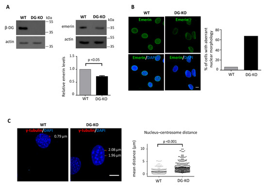 DG–KO cells showed decreased emerin levels, aberrant nuclear morphology and increased nucleus-centrosome distance. (A) Emerin levels were assessed in WT and DG–KO C2C12 cells by western blotting, using antibodies against β-DG, emerin and actin (loading control). Results correspond to mean +SEM of three separate experiments, with a p-value showing significant differences (unpaired t-test); (B) WT and DG–KO C2C12 cells were immunolabeled for emerin and counterstained with DAPI to decorate nuclei. The percentage of cells with aberrant nuclear morphology was calculated from three independent experiments (n = 150 nuclei), with a p-value showing significant differences (unpaired t-test). Scale bar, 10 µm; (C) WT and DG–KO C2C12 cells were double stained with anti-γ-tubulin antibodies and DAPI to decorate centrosomes and nuclei, respectively. Typical nuclei showing centrosome positioning are shown; scale bar, 10 µm. Nucleus-centrosome distance were measured in overlaid images using Leica Application Suite, Advanced Fluorescence Lite imaging processing software. Data in the graph correspond to the mean ± SD of triplicate experiments (n = 300 nuclei), with p-value denoting significant difference (student’s t-test).