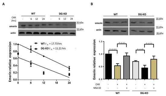 We envisaged that decreased emerin levels exhibited by DG–KO cells may be the result of a reduction in protein stability, due to the lack of its interacting partner, β-DG. WT and DG–KO cells were treated with cycloheximide to inhibit protein synthesis, and emerin turnover was then analyzed. A reduction in the half-life of emerin from 17.7 to 12.2 h was found in DG KO cells (Figure 7A) and this decrease was reversed upon treatment with the proteasome inhibitor MG132 (Figure 7B), which is consistent with the idea that degradation of emerin is increased in cells lacking DG.