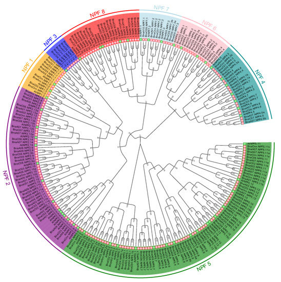 Phylogenetic tree of coding nucleotide sequences of the NITRATE TRANSPORTER 1 (NRT1)/PEPTIDE TRANSPORTER (PTR) family (NPF) in Brassica napus and Arabidopsis thaliana. The phylogenetic tree was constructed by Molecular Evolutionary Genetics Analysis (MEGA) 5.1 with neighbor-joining method and 1000 replicates. A total of 246 nucleotide sequences including 193 from B. napus (pink circular), and 53 from Arabidopsis (green circular) were involved in the analysis.