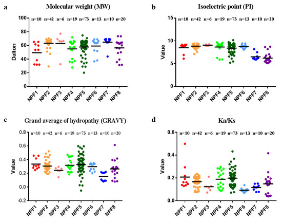 Molecular characterization of the NPF proteins in Brassica napus. (a) molecular weight (MW); (b) theoretical isoelectric point (PI); (c) grand average of hydropathy (GRAVY); (d) Ka/Ks values.