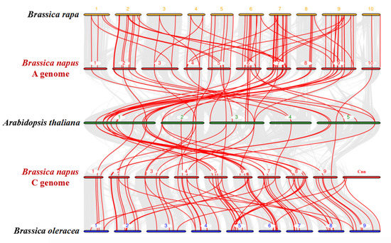 Synteny analysis of the NPF genes in Brassica napus, B. rapa, B. oleracea and Arabidopsis thaliana chromosomes. Gray lines in the background indicate the collinear blocks within B. napus and other plant genomes, while the red lines highlight the syntenic NPF gene pairs. Genes located on B. napus A genome are syntenic with genes of B. rapa and A. thaliana, while genes located on B. napus C genome are syntenic with genes of B. oleracea and A. thaliana.