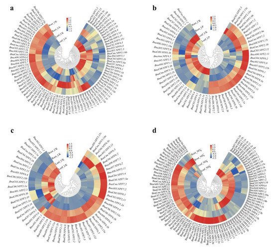To identify the roles of BnaNPFs in regulating rapeseed against various nutrient supplies, we investigated their transcriptional responses under N, phosphorus (P), potassium (K) deficiencies, and ammonium toxicity environment based on RNA-seq data (Table S4). The results showed that the expression profiles of BnaNPF genes varied largely in response to different nutrient levels (Figure 5, Table S4), indicating their complex roles in the growth regulation of B. napus under diverse nutrient conditions. Under N starvation, the expression profiles of the BnaNPF genes were significantly altered (Figure 5a). Compared to the N sufficient condition, 65 and 47 BnaNPFs in leaves and roots were differentially expressed, respectively. Approximately 84.6% (55/65) differentially expressed genes (DEGs) were significantly upregulated in leaves under N limitation condition, while only 44.7% (21/47) DEGs in roots were significantly upregulated. Among them, 11 BnaNPF genes were significantly induced and only two genes (BnaC02.NPF2;2 and BnaC04.NPF6;2) were inhibited both in leaves and roots. Under P starvation, 42 and 31 BnaNPF DEGs in leaves and roots were identified, respectively (Figure 5b). In leaves, 28 BnaNPF genes were significantly upregulated by P stress, and 14 BnaNPF genes were significantly downregulated. In roots, 21 and 10 BnaNPF DEGs were induced and repressed under P deprivation, respectively. Four BnaNPF genes were significantly upregulated and two genes (BnaA05.NPF1;1 and BnaC09.NPF8;3b) were downregulated both in leaves and roots. Under K stress, the expression of 22 and 43 BnaNPF genes were significantly altered in leaves and roots, respectively (Figure 5c). Moreover, the expression of four BnaNPF DEGs were significantly induced and two genes (BnaA05.NPF1;1 and BnaA09.NPF7;3) were significantly inhibited both in leaves and roots under K stress. In addition, 51 and 72 BnaNPF DEGs were identified in leaves and roots respectively under NH4+ toxicity (6 mM N), which were more than other nutrient stresses (Figure 5d). Most of the BnaNPF DEGs were downregulated when ammonium was supplied as the sole N source, including 35 genes in leaves and 48 genes in roots. Only six genes were upregulated and 14 genes were downregulated both in leaves and roots under NH4+ supply only.