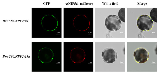 Subcellular localization of BnaC08.NPF2;9a and BnaC06.NPF2;13a. 35S::BnaNPFs-GFP and 35S::AtNIP5;1-mCherry constructs were introduced into Arabidopsis protoplasts. The GFP and mChery fluorescence was observed with a confocal laser-scanning microscope. The images were taken in the dark and white field.