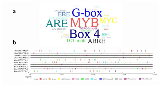 Transcription factors (TFs) play important roles in transcriptional regulation of downstream genes by binding to cis-regulatory elements (CREs) in the promoters. To identify the core TFs regulating BnaNPFs, the 2.0-kb upstream sequences of the core BnaNPF start codons were used to identify the over-accumulated CREs. The results showed that CREs are abundant in the 2.0-kb promoter regions of the 10 core BnaNPF genes (Figure 10). Apart from the abundance of the common CREs including the TATA box and the CAAT box (data not shown), the MYB and G-box elements were most highly enriched in the BnaNPF promoter regions. These CREs have been reported to be involved in the molecular regulation of N status in plants [40,41,42]. Meanwhile, we also found a large number of phytohormone responsive CREs, including ABRE, as-1, CGTCA-motif, ERE, TCA-element, TGACG-motif and MYC elements (Figure 10b). Notably, the GATA-box was only identified in the promoters of BnaC08.NPF2;9a, BnaC06.NPF2;13a, BnaA07.NPF4;6 and BnaC06.NPF4;6. These results suggested that complex regulatory networks might be involved in the transcriptional regulation of the core BnaNPF genes.