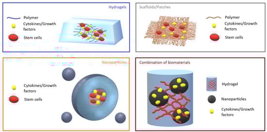 Representative images of biomaterials. Hydrogels, scaffolds/patches, and nanoparticles loaded with growth factors/cytokines and stem cells, and their combination are shown.