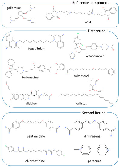 On these grounds, a VS study on the hM2 subtype was undertaken with a view to finding novel allosteric modulators by screening an extended dataset of known drugs. The study was organized in three steps. In the first preliminary part, an efficient VS strategy was developed by considering and combining two representative resolved hM2 structures and a purposely collected database including 30 known allosteric modulators which were dispersed among 2970 suitably selected decoys. As already validated in previous analyses [18,19], the VS strategy involved an extensive rescoring of the computed docking results combined with the development of linear consensus predictive models by applying the enrichment factor optimization algorithm (EFO) [20]. Then, the so tuned in silico procedures were utilized to screen a DrugBank-based database [21] including about 6000 known drugs and the resulting six most promising ligands (see Figure 1) were experimentally tested. Given the remarkable experimental results afforded by dequalinium, the third step involved the collection of a focused small set of commercially available bis cationic derivatives, which were similarly analyzed and experimentally tested to assess their biologic activity on hM2 and to investigate the corresponding structure–activity relationships.
