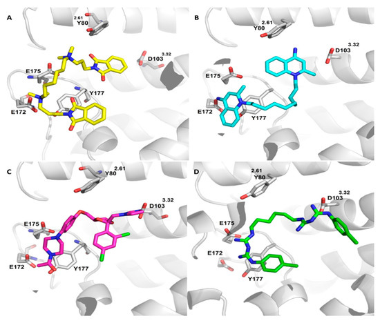 Putative complexes as computed by docking simulations for (yellow carbon atoms, (A) W84, (azure carbon atoms, (B) dequalinium, (purple carbon atoms, (C) ketoconazole and (green carbon atoms, (D) chlorhexidine within the hM2 binding sites in its active state (PDB Id: 4MQT). In all figures, the loop between residues 411 and 418 was not displayed for sake of clarity.