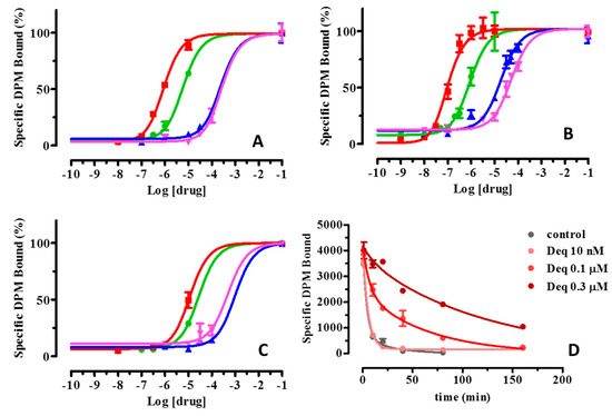 All tested compounds were purchased from Merck KGaA (Darmstadt, Germany). The radioligand binding experiments were performed with membranes from Chinese Hamster Ovary (CHO) cells stably transfected with the five cloned human muscarinic receptor subtypes (hM1-5). Membrane fractions were prepared according to the protocol, which have been previously described [32]; membranes were stored at −80 °C until use. Nonspecific binding was defined by the radioactivity bound in the presence of 10 µM atropine.