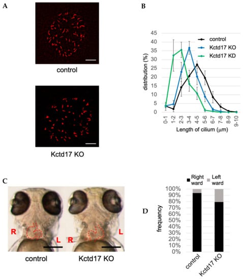 Suppression of Kctd17 in zebrafish impairs ciliogenesis in Kupffer’s vesicle and induces situs inversus (A) Staining of acetylated alpha-tubulin in the cilia of Kupffer’s vesicle at 12 h post-fertilization (hpf) of wild-type (control) or Kctd17 knockout (KO) zebrafish. (B) Distribution of the cilia length in Kupffer’s vesicle at 12 hpf in control or Kctd17 KO or knockdown (KD) zebrafish. (C) Representative in vivo images of control and Kctd17 KO zebrafish at 3 days post-fertilization (dpf). Control and Kctd17 KO zebrafish show rightward and leftward looping of the heart, respectively. Please see Video S1. (D) At 3 dpf, rightward and leftward looping of the heart is observed in about 95% of the control zebrafish and about 20% of the Kctd17 KO zebrafish, respectively. Scale bar: 20 μm (A), 200 μm (C).