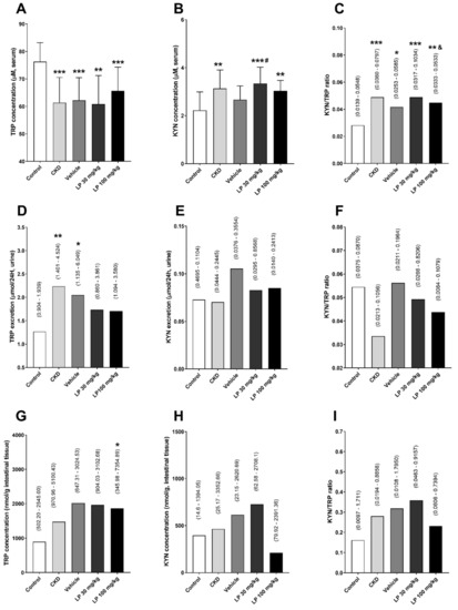 Changes in tryptophan (TRP) and kynurenine (KYN) concentrations, and KYN/TRP ratio among experimental groups in serum (A–C), diurnal urinary excretion (D–F), and intestinal homogenate (G–I). Data are shown as mean ± SD (A,B) or median and range (C–I). * p < 0.05, ** p < 0.01, *** p < 0.001, control vs. others; # p < 0.05, vehicle vs. others; & p < 0.05, LP 30 mg/kg vs. LP 100 mg/kg.