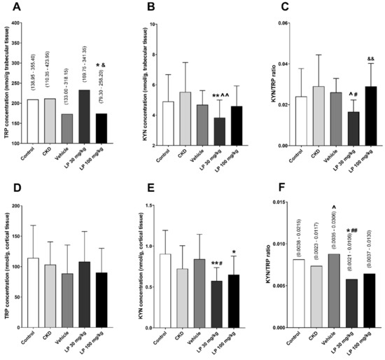 Changes of tryptophan (TRP) and kynurenine (KYN) concentrations, and KYN/TRP ratio among experimental groups in the femoral trabecular (A–C) and cortical (D–F) bone regions. Data are shown as median and range (A,F) or mean ± SD (B–E). * p < 0.05, ** p < 0.01, control vs. others; ^ p < 0.05, ^^ p < 0.01 CKD vs. others; # p < 0.05, ## p < 0.01, vehicle vs. others; & p < 0.05, && p < 0.01, LP 30 mg/kg vs. LP 100 mg/kg.