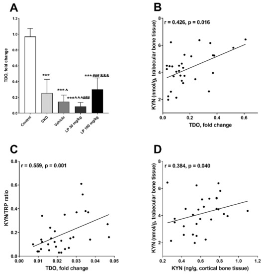 Changes in tryptophan 2,3-dioxygenase (TDO) expression level in the femoral bone (A) among experimental groups, and the association between TDO messenger RNA (mRNA) level and kynurenine pathway activation in bone tissue of CKD rats treated with LP533401 (B–D). Data are shown as mean ± SD. *** p < 0.001, control vs. others; ^ p <0.05, ^^^ p < 0.001, CKD vs. others; ### p < 0.001, vehicle vs. others; &&& p < 0.001, LP 30 mg/kg vs. LP 100 mg/kg.