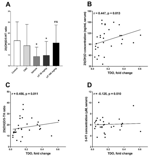 In the next step of our work, we tried to find the factors that influenced bone TDO gene expression in CKD rats treated with LP533401. Previously, we showed that LP533401 administration to rats with CKD reduced turnover of circulating 5-HT [11], and it simultaneously caused the disturbances in serum 25-hydroxyvitamin D (25(OH)D) status [31]. In general, the dose-dependent rise in its concentration was observed in animals treated with LP533401 [31]. Recently, we demonstrated that not only peripheral 5-HT [32], but also the disturbances in calciotropic hormones, namely, the advantage of 25(OH)D over 5-HT, reflected by the 25(OH)D/5-HT ratio, can affect osteoblastogenesis in LP-treated animals. As shown in Figure 5A, 25(OH)D/5-HT ratio in the LP 100 group was comparable to the control, and it was significantly higher in this group than in the LP 30 and vehicle groups, where we observed a significant decrease in the 25(OH)D/5-HT ratio in comparison with the control. Moreover, both serum 25(OH)D levels, as well as 25(OH)D/5-HT ratio, were positively associated with TDO gene expression (Figure 5B,C), while serum 5-HT level did not correlate with TDO mRNA expression (Figure 5D).