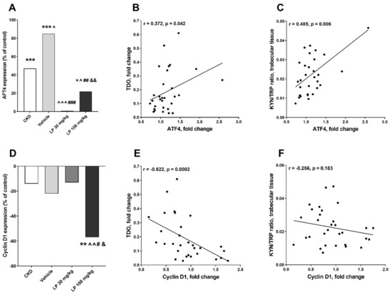 Changes in activating transcription factor (ATF4) and cyclin D1 gene expression among experimental groups (A,D), and their associations with tryptophan 2,3-dioxygenase (TDO) expression (B,E), and kynurenine to tryptophan (KYN/TRP) ratio in trabecular bone tissue (C,F) in rats with CKD treated with LP533401. Data relate to the control taken as 0%. * p < 0.05, ** p < 0.01, *** p < 0.001, control vs. others; ^ p < 0.05, ^^ p < 0.01, ^^^ p < 0.001, CKD vs. others; # p< 0.05, ## p < 0.01, ### p < 0.001, vehicle vs. others; & p < 0.05, && p < 0.01, LP 30 mg/kg vs. LP 100 mg/kg.