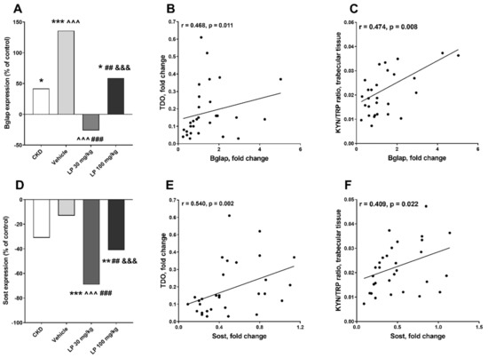 Changes in osteocalcin (Bglap) and (sclerostin) Sost gene expression among experimental groups (A,D), and their associations with tryptophan 2,3-dioxygenase (TDO) expression (B,E), and kynurenine to tryptophan (KYN/TRP) ratio in trabecular bone tissue (C,F) in rats with CKD treated with LP533401. Data relate to the control taken as 0%. * p < 0.05, ** p < 0.01, *** p < 0.001, control vs. others; ^^^ p < 0.001, CKD vs. others; ## p < 0.01, ### p < 0.001, vehicle vs. others; &&& p < 0.001, LP 30 mg/kg vs. LP 100 mg/kg.