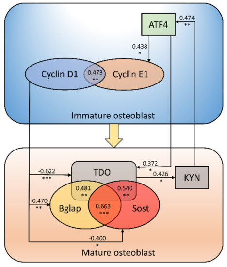 Schematic presentation of the possible role of bone kynurenic pathway activation in the osteoblast maturation process. Each value is Spearman’s rank correlation coefficient (R) value between the genes. * p < 0.05, ** p < 0.01, *** p < 0.001 indicate statistically significant values; a negative value indicates an inverse correlation between parameters. ATF4—activating transcription factor 4; Bglap—osteocalcin; KYN—kynurenine; Sost—sclerostin; TDO—tryptophan 2,3-dioxygenase.