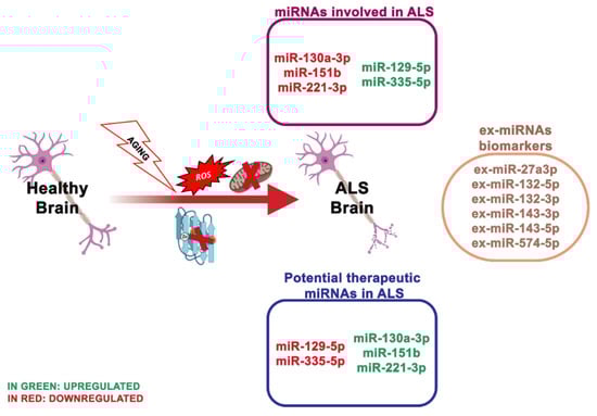 - Freischmidt, A.; Müller, K.; Zondler, L.; Weydt, P.; Mayer, B.; von Arnim, C.A.F.; Hübers, A.; Dorst, J.; Otto, M.; Holzmann, K.; et al. Serum microRNAs in sporadic amyotrophic lateral sclerosis. Neurobiol. Aging 2015, 36, 2660.e15–2660.e20. [Google Scholar] [CrossRef]