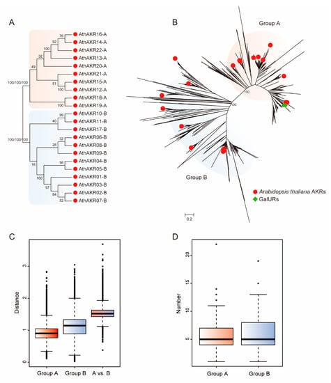Phylogenetic relationship of the aldo-keto reductases (AKR) gene family and the characteristics of group A and B genes. (A) Phylogenetic tree of AKRs in A. thaliana. The tree was constructed using the maximum-likelihood (ML) method and examined by the maximum-parsimony (MP) and neighbor-joining (NJ) methods. The bootstrap values were calculated with 1000 replications. (B) A phylogenetic tree of all 1268 AKRs in the selected 36 plant species with the known GalURs. Red circles represent A. thaliana AKRs, and green boxes represents GalURs. (C) Nucleotide distance of group A and B AKR genes. (D) The boxplots of exon numbers in group A and B AKR genes.