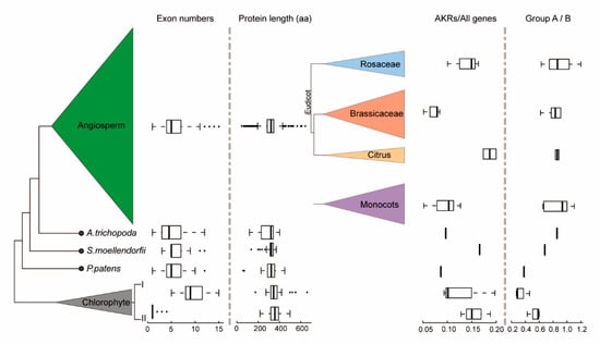 Distribution of the structural characteristics and numerical statistics of the aldo-keto reductases (AKR) gene family in plant species. From left to right: (i) the phylogenetic relationship of higher plants and algae; (ii) boxplots of the exon numbers of AKR genes; (iii) boxplots of the lengths of AKR proteins; (iv) the selected monocots and dicots in angiosperms; (v) boxplots of the percentage of AKR genes occupying all genes; (vi) boxplots of the ratio between group A and B AKR genes.